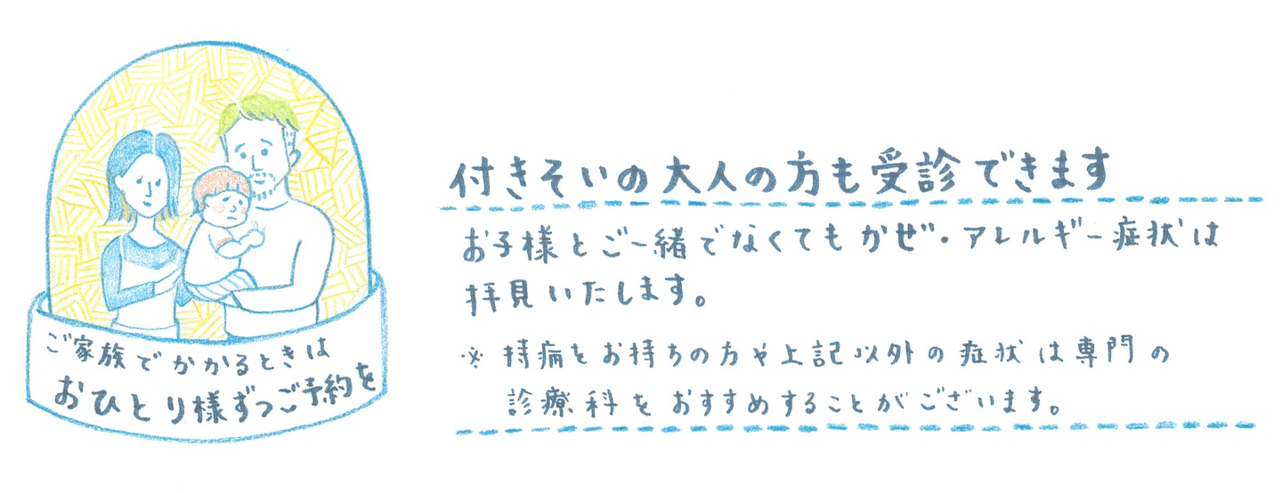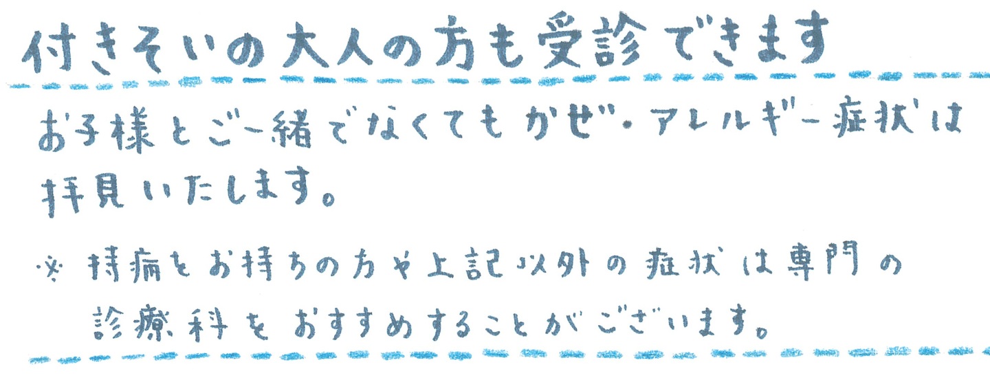 お子様のみの受診も可能ですが、症状があり 一緒に医師の説明を聞きたいなどの場合は必ず同伴をお願いします。